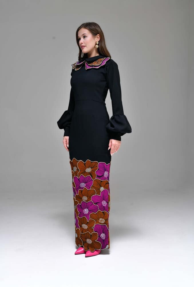 The “Aya” dress channels the Queen’s powerful and versatile presence on the chessboard. This ankle-length black pencil dress merges classic sophistication with bold elegance through its striking cutout Ankara patterns, each rim hand-studded with dazzling crystals.