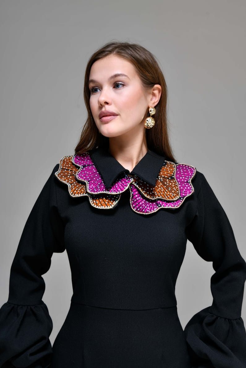 The balloon sleeves and hanging bead details reflect the Queen’s commanding movement and grace. The detachable neck collar, adorned with beaded and crystal-studded petals, enhances the dress’s opulent versatility.