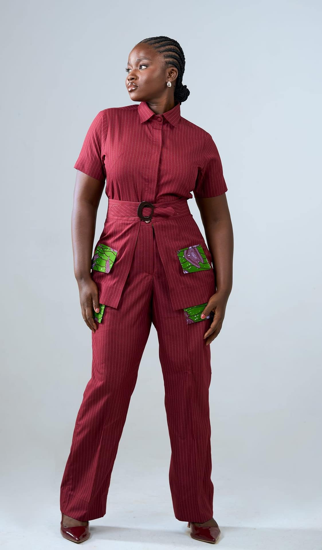 Burgundy pinstripe fabric with Ankara pocket detailing
